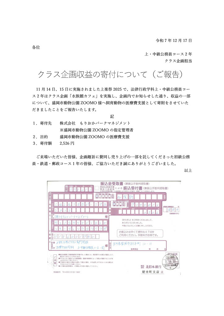 先日行われました学園祭の中で、本校コースの「法律行政学科上・中級公務員コース」が企画実施した”水族館カフェ”にて得た収益の一部を、盛岡市動物公園ZOOMO様へ飼育動物の医療費支援として寄付致しました。 ご来場いただいた皆様、企画趣旨に賛同し売り上げの一部を託してくださいました初級公務員鉄道・郵政コース1年生の皆様、ご協力いただきありがとうございました。